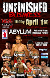 Raymond Serrano, 14-0, 7 KOs vs. Corey Alarcon, 14-16-1, 4 KOs Andres Taylor, 16-1-2, 7 KOs vs. Rayshawn Myers, 3-6. 2 KOs Ardrick Butler, 5-4, 2 KOs vs. Mike Denby, 3-8-3, 2 KOs Juan Rodriguez Jr., 5-0, 3 KOs vs. Andrew Jones, 0-4 Patrick Majewski, 15-0, 10 KOs vs. Allen Medina, 8-18, 1 KO Keenan Smith, 3-0, 1 KO vs. Joshua Nieves, debut John Mercurio, 3-0, 3 KOs vs. William Miranda, 2-2 Kamil Laszczyk, 2-0, 2 KOs vs. Javier Ramos, 2-5