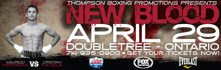 Thompson Boxing Promotions’ “New Blood” series fistic action will take place at The Doubletree Hotel in Ontario, California. Tickets for “NEW BLOOD” are priced at $75, $45, and $30. They are available now and may be purchased by calling 714-935-0900.