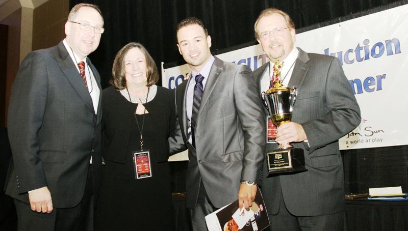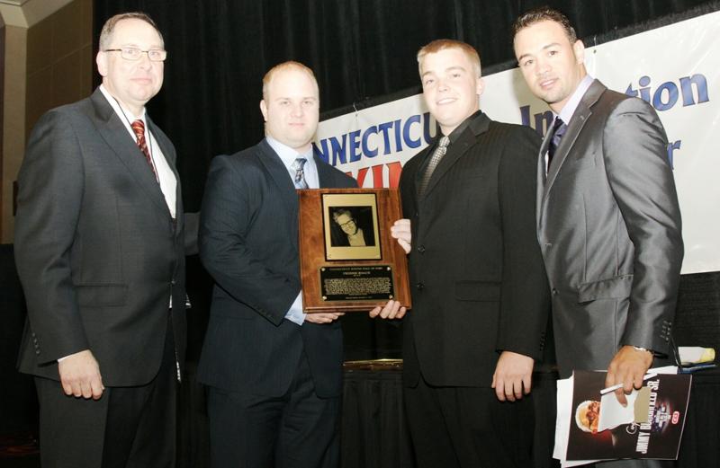 (L-R) CBHOF president Glenn Feldman, Chief of the Mohegan Tribe Lynn Malerda (accepting on behalf of Mr. Etess), MC Delvin Rodriguez and CBHOF board member Don Trella.
