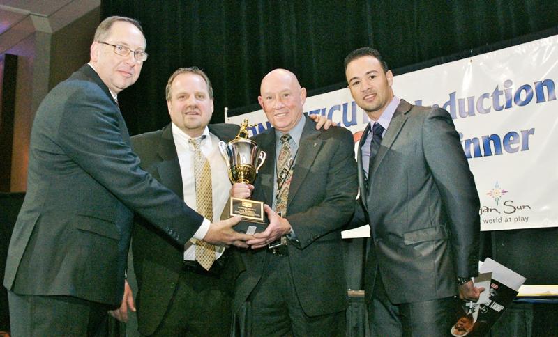 (L-R) CBHOF president Glenn Feldman, CBHOF board member Mike Mazzulli, Dick Flaherty, and MC Delvin Rodriguez.