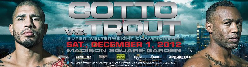 “Showdown: Cotto vs. Trout” is a 12-round battle between Four-Time and Three-Division World Champion Miguel Cotto and WBA Super Welterweight World Champion Austin Trout taking place on Saturday, December 1 at Madison Square Garden in New York City. The co-featured fights will see Jayson Velez take on Salvador Sanchez II in a 10-round fight for the vacant WBC Silver Featherweight title and Danny “Miracle Man” Jacobs battle Chris “The Irish Ghost” Fitzpatrick in a 10-round middleweight fight. The event is promoted by Miguel Cotto Promotions and Golden Boy Promotions in association with Greg Cohen Promotions, sponsored by The Puerto Rican Tourism Board and Corona and will be televised live on SHOWTIME at 9:00 p.m. ET/PT (delayed on the West Coast).